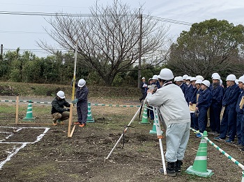 12月10日(月)、朝9時から12時まで、熊本県鳶工業組合連合会の方々においでいただき、「土工事」の授業をしていただきました。当日は寒波によりかなり冷え込んでおり、みんな完全防備で授業に挑みました。