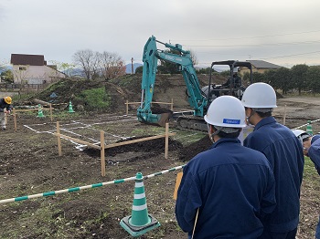 内容は、実際に使用されている道具(建設機械)を使い、基礎やり方出し~床堀~埋め戻しまでを見学しました。レベルやトランシットを使って測量する時の合図の仕方や、バックホーを使って床堀や埋め戻しをするプロの技に、「スゴイ!」とか「カッコイイ!」という声が上がっていました。