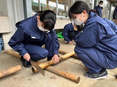 2年次生になり、初めて実習服に袖を通す生徒たち。早速、造園技能検定の練習を行いました。実技では竹や石などを使って小さな庭園を作ります。今日は、丸太を水平にしてノコギリで真っ直ぐ切る練習をしました。ノコギリの使い方に慣れていない人もいましたが、綺麗に切ることができました。