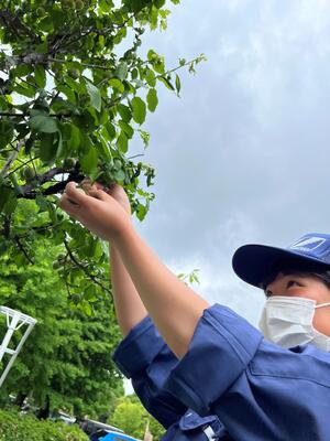 脚立や木の上に登って、丁寧に収穫を行うことができました。「梅ジュース飲みたいな~」等と生徒たちの声が聞こえてきました。真夏の実習後に飲む梅ジュースはおいしいはず!!