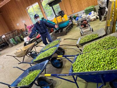 2年次生の造園技術の時間に梅の収穫を行いました。害虫などの被害も無く、粒も大きく揃っていて綺麗で、香り良い梅ができました!昨年の倍ほどの収穫でした!!