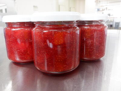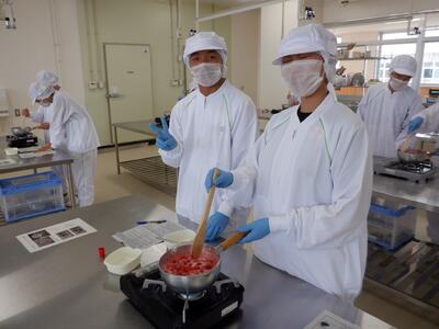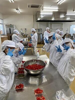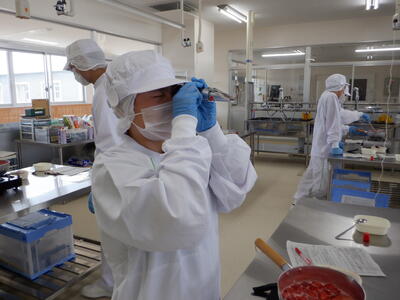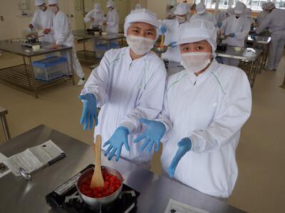 食品製造2年次生が、初めての持ち帰り製造実習を行いました。初回は、「イチゴジャム」の製造でした。作ることの楽しさと食べてもらう人のことを考えて、衛生面に気をつけながら実習を行うことができました。
