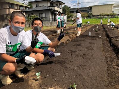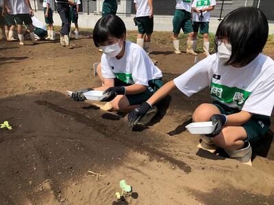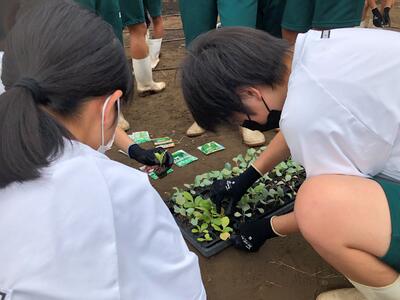 9月7日(火)グリーンデザインの授業でダイコンとハクサイの種を撒きました!1つの穴に2粒ずつ離して撒くことができました。生徒たちは「小さな種なのに、あんなに大きなダイコン、ハクサイになるなんてすごーい!」と言いながら実習をしていました。少し大きくなったら間引きして大きなダイコン・ハクサイにします。持ち帰り試食、販売ができる日が楽しみです。
