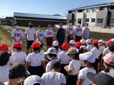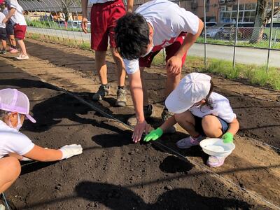 10月4日(月)午後から近隣にある室小学校とダイコン・ハクサイの種まき交流会を行いました。新型コロナウイルス感染症拡大防止の為、1ヶ月ほど延期し、高校生を限定した活動となりました。小さな種を見た小学校2年生の子ども達は「すごく小さい~初めて見た!」などと言いながらも小さな指で一粒一粒丁寧に種まきをしていました。高校生は先生役で子ども達の間に入り上手に指導することが出来ていました。コロナ禍で外部との交流が減る中、久しぶりの交流会だったので楽しそうに活動していました。12月頃には大きなダイコンとハクサイが収穫できる予定です。子ども達の笑顔が楽しみです!