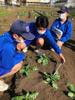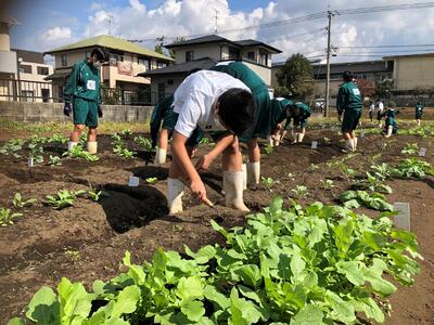 1年次生の「農業と環境」を受講している生徒たちの畑に色々な野菜を栽培しています。ハクサイ、ダイコン、にんじん、ブロッコリー、ほうれん草などそれぞれ好きな野菜を育てています。今日は大きくなった野菜の間引きを行いました。ダイコンの間引きを行った生徒は「持って帰って食べます!」と嬉しそうに話していました。あと1~2ヶ月すると立派な野菜が収穫できそうです!「みんなでおでんが出来るといいね♪」と話しながら除草作業まで終わらせることができました。