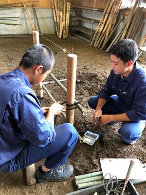 農業系列 園芸・造園では造園技能検定3級合格に向けて練習をスタートしています。今年は人数が多いので、筆記試験・実技試験に半分ずつ分かれて行っています。実技では竹や石などを使って小さな庭園を作ります。早く終わった生徒は、終わっていない人のところへ行って教えてあげるなど協力する姿がみられました。全員合格できるように頑張りたいです!