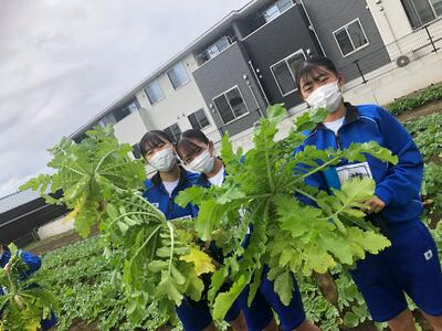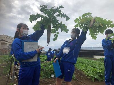 グリーンデザインで育てたダイコンを収穫しました!大きなダイコンを見極めて収穫する人や、小さいダイコンが欲しい生徒もいて楽しい授業になりました。女子生徒はダイコンを引き抜くのに力がいるので、「抜けなーい!」と言いながらも抜いた後は「大きいでしょう♪」と自慢気に話していました。持ち帰って美味しく家族で食べて欲しいです。次の時間に食べた感想を聞きたいと思います。