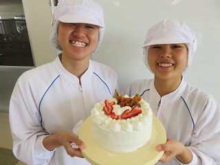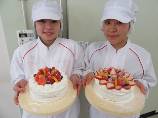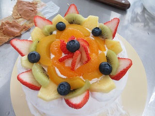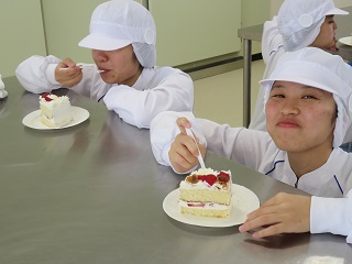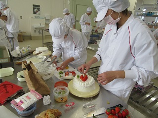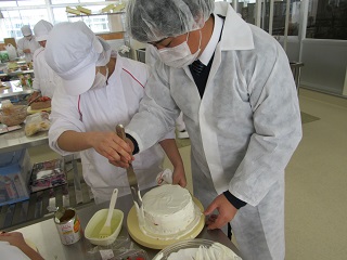 農業系列食品製造は、毎年3年次でデコレーションケーキの製造を行っています。この授業の目標は「店頭に出せるくらいきれいに仕上げる」ことです。まずは担当教師にナッペ(生クリームを塗る工程)を習い、いざ実践!パレットナイフの使い方に四苦八苦しましたが、果物の切り方に工夫し、こだわりを持って仕上げることができました!また、3年次生の担任にも参加して頂きました。生徒が担任に手を取りながら指導をします。数ヶ月後には社会に翔び立つ3年次生。このケーキを囲んで、高校生活や将来について、改めて家族と笑顔でお話しながら食べてくださいね。