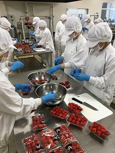 農業系列食品製造では、生徒実習製品の製造がスタートしました。その口火を切ったのが「イチゴジャム」です!本日の内容は、「イチゴのへた取り」と「砂糖漬け」です。これまでの課題を教訓に、一つ一つ丁寧にへたを取り、果実の傷みなどがないか、しっかりとチェックを行いました。このイチゴは砂糖に漬け、保存性を高め、5月のイチゴジャム加工の日まで、冷凍保存しておきます。完成したら、各種イベントや翔陽祭などで販売いたしますので、是非お買い求めください。
