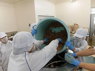 令和となり、農業系列食品製造、最初の製造実習は、味噌製造です。まずは、麦麹の仕込みです。熊本県が世界に誇る『麦味噌』の元となる麦麹。大型の蒸し器で麦を蒸し、空冷しながら、一粒一粒に分けていきます。その後は、自動製麹器(じどうせいきくき)に入れ、種麹を振りかけて、2日間・・・。こうして麦麹が完成します。