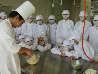 農業系列食品製造は、毎年2年次の生徒で「洋菓子講習会」を行っています。10月29日、光の森に店舗を構えていらっしゃるVie Aimable(ヴィー・エマーブル)の西田勉オーナーシェフに来校して頂きました。西田シェフは本校卒業生で、高卒でパティシエとなり、34歳の若さでオーナーをされています。なんと、高校では野球部のキャプテンをされていたそうです!