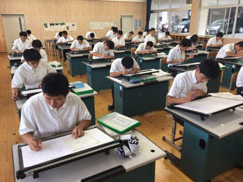 始めは1年次の工業技術基礎の建築製図です。課題は平屋建て木造住宅のトレースです。基準線が書いてある図面に図形の切り欠きが施されたテンプレートという定規を使い作図を行います。生徒らは初めての作業に戸惑いながらも集中して取り組んでいる様子です。