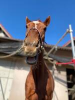 きれいな茶色の毛をした馬です。専門用語で栗毛(くりげ)と言います。食いしん坊で、ご飯の時はそわそわしています。左の後ろ肢だけ靴下を履いたように白くなっています。