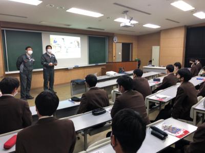 まず校内でご協力いただいた建設会社様から、会社の概要や施工管理・安全衛生管理などの話がありました。また説明の中で本校の卒業生とテレビ電話を利用しリアルタイムで質問できる時間を用意して頂きました。