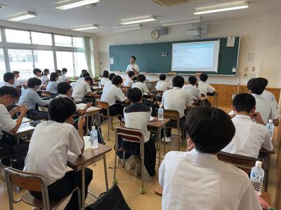 7月23日(火)に「中学生体験入学」(オープンスクール)を開催したところ、県内からここ数年で最も多い中学生と保護者(約680名)に参加していただきました。全体会では、総合学科や高校入試に関する説明や本校生による体験発表などがあり、その後、事前に希望した系列に分かれての模擬授業を2コマ体験してもらいました。