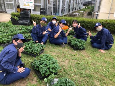 2年次の総合実習で校内にある花壇とビニルハウスの脇にマリーゴールドの苗を植えました。