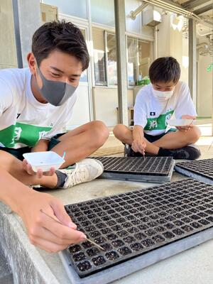 グリーンデザインの授業でダイコンとハクサイの種を撒きました!ハクサイはセルトレー、ダイコンは1つの穴に2粒ずつ離して撒くことができました。生徒たちは「小さな種なのに、あんなに大きなダイコン、ハクサイになるなんてすごーい!」と言いながら実習をしていました。