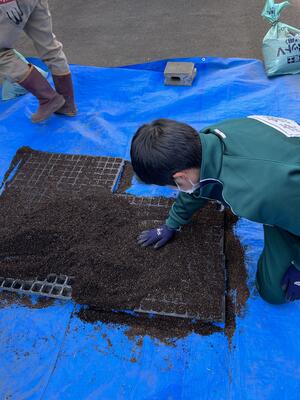 スピードポッターという道具を使用し、皆で協力して効率よく土を詰めていきました。