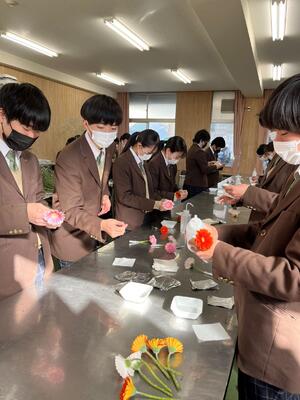 2月28日に卒業生へ在校生がコサージュを手作りしました!農業系列、家庭系列、生徒会などを中心にコロナ過で密にならないように行いました。感染予防の為、事前練習などが出来なかったのですが、卒業生への想いを込めながら1つ1つ丁寧に作ることができました。作成した2年次生は、「とても楽しかったです。来年、私たちも貰えるのかな~」と嬉しそうな表情をしていました。3年次生のみなさん、卒業おめでとうございます!
