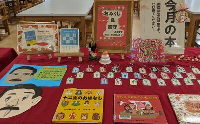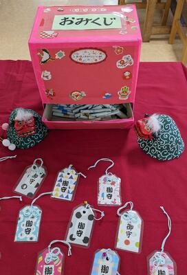他にも、1月末までは、図書委員が作ったお守り、おみくじも置いています。