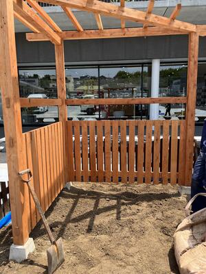 2日間に分けて、枠づくり、砂入れ、パーゴラ設置、草花植えなどを行いました。