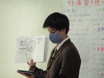 次に、3年次の「総合的な探究の時間」でまとめたポスターを、普通、農業(園芸造園、食品製造)、商業、家庭、工業(電気電子、建築、機械)の科目を学ぶ生徒の代表のみ発表しました。各自工夫を凝らした発表を行い、他の代表生徒たちの質問にもしっかり答えていました。