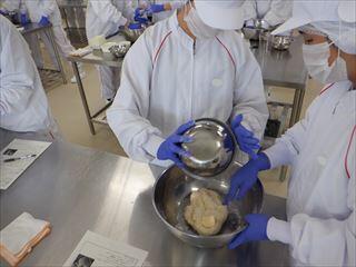 2年次生のときには、袋の中でこねる方法でミルクパンを製造しました。今回は初めて、直接生地に触れ、こねる方法で製造をしました。