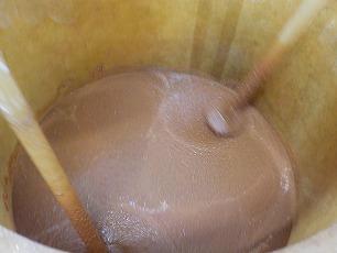 「かい入れ」とは熟成中のしょう油もろみを、「櫂(かい)」と呼ばれる道具を用い、もろみ内に空気を含ませる行程です。これによって、しょう油の発酵を担ってくれる麹カビ(コウジカビ)の発酵促進となり、より美味しく、香り豊かな仕上がりになります。