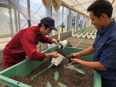 5月31日、6月1日の2日間で3年次生の総合実習等の時間を使ってシクラメンの鉢替えを行いました。3号ポットで育てていた苗が順調に大きくなり、6号鉢に植え替えです!初めて鉢替えする生徒達でしたが、同級生にやり方を教え合ったりしながら工夫して実習することができました。