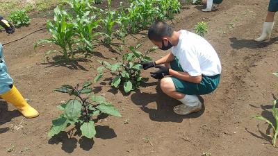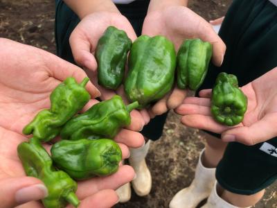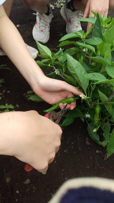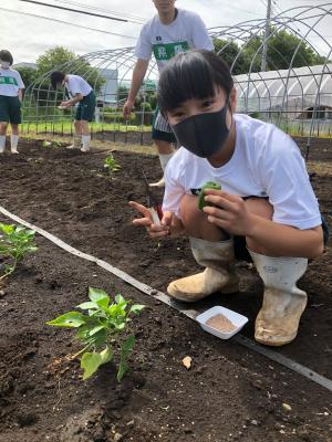 1年次生の選択科目「農業と環境」ではナス・ピーマン・それぞれ育ててみたい野菜を一人一畑で育てています。本日は除草と追肥を行いました。苗はまだ大きくありませんが、よく見るとピーマンがなっていました!収穫したピーマンをそのまま生でかじり付く生徒もいました。自宅へ持って帰って美味しく食べて貰いたいです。もう少し大きくなったら沢山収穫できると思うので、楽しみに管理したいです。