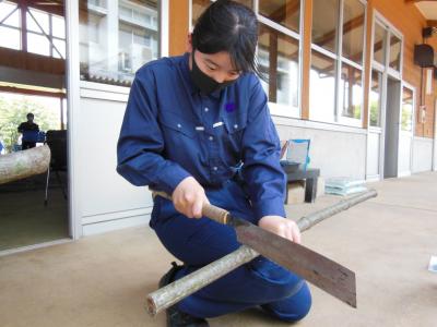 園芸・造園の2年次生が受ける造園技能検定の練習が本格的にスタートしました。本日は基本の竹・丸太について学び、実際にノコギリを使って切る練習をしました。初めて使うノコギリに戸惑いながらも、真っ直ぐ綺麗に切る練習を何度も行い、最後には綺麗に切ることが出来ました。全員合格目指して頑張ります!