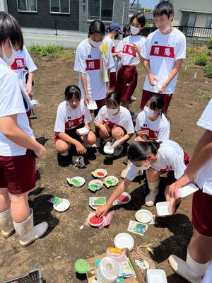 1年次生の選択科目「農業と環境」ではナス・ピーマン・トマト等それぞれ育ててみたい野菜を一人一畑で育てています。本日は観察・除草・播種を行いました。苗はまだ大きくありませんが、よく見るとピーマンやナス・トマトがなっていました!収穫したナスの形に驚く生徒もいました。自宅へ持って帰って美味しく食べて貰いたいです。もう少し大きくなったら沢山収穫できると思うので、楽しみに管理したいです。