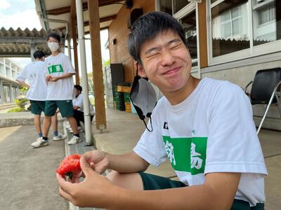 2年次生のグリーンデザインではトマトの観察を行っています。真っ赤に実ったトマトを収穫し、口いっぱいに頬張る生徒たち。「家で食べるより甘い!」と言う生徒もいました。ミニトマトと大玉トマトの比較をしながら、仲良くみんなで食べていました。