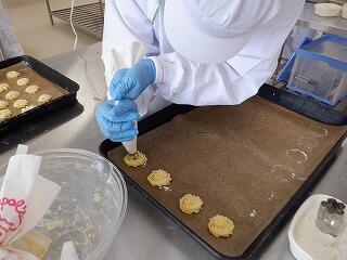 クッキー生地の大きさを揃えないと、焼きむらがでてしまうので、絞り出しを慎重に行い、キレイに揃えるように頑張りました。