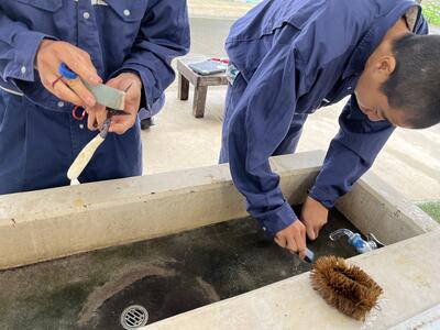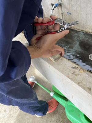 雨の日は外での実習ができないため、道具の手入れとしてハサミの刃を研ぎました。
