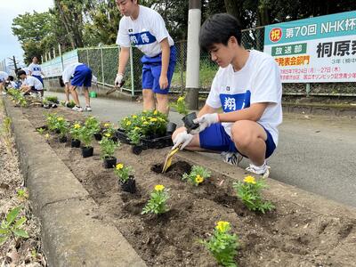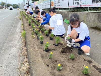 学校設定科目グリーンデザインの授業で、翔陽高校前の花壇にマリーゴールドの苗を定植しました