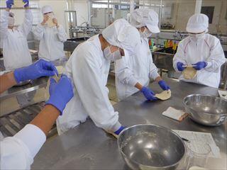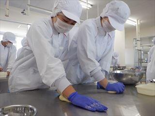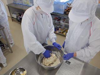 2年次生のときには、袋の中でこねる方法でミルクパンを製造しました。今回は初めて、直接生地に触れ、こねる方法で製造をしました。