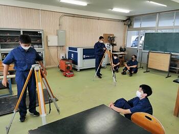 2年次で開講される「建築実習α」では、次の3つのテーマを4週(8時間)ごとにローテーションします。テーマは、「手作業による木材加工」「レベル測量」「平板測量」です。建築における基本的な内容なのでみんな真剣に取り組んでいます。