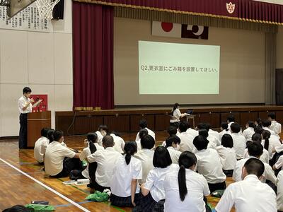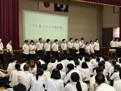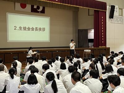 6月23日(金)の6限目に生徒総会を行いました。コロナ禍だった昨年はオンラインでしたが、今年は体育館に集まって開催することができました!