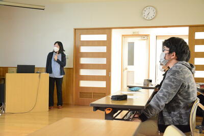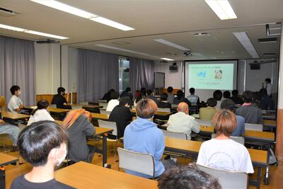 スクリーンを使っての講演。