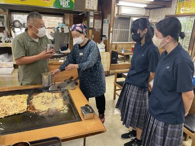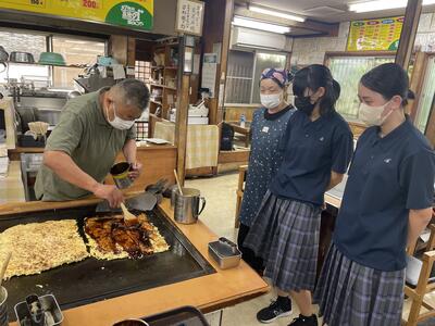 実際に、お好み焼きができる工程を実演してくださり、美味しそうなお好み焼きが完成しました。