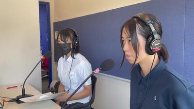 初めて、マイク・ヘッドホン等を使用しながら収録をしたので、生徒たちは緊張しつつも楽しく行いました。