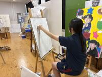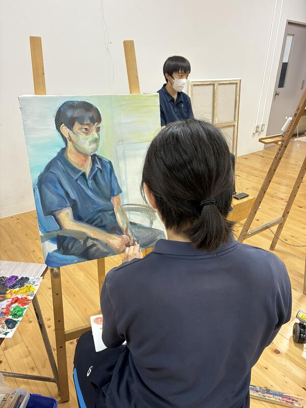 元美術部長のマツウラ サエさん。10/18土曜日に学校に来て、自画像以外の人物油彩画を初めて描きました。