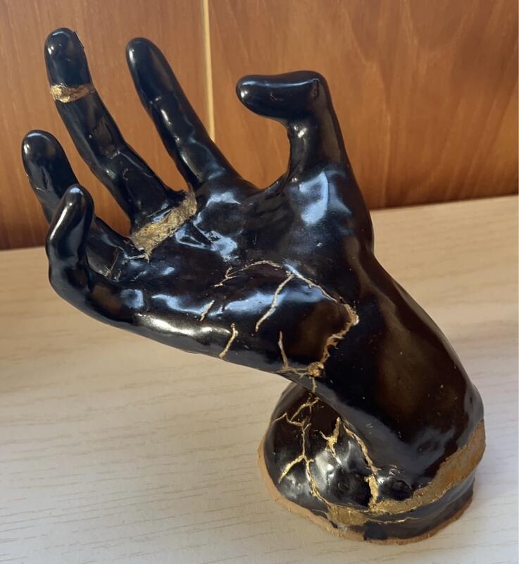 焼成時に壊れた部分を金継ぎの技法でつなぎ合わせています。