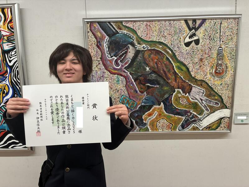 熊日主催 『くまもと「描く力」2025』に、美術部1年 内野志宣君、3年 加治木琉人君の2人が出品しました。
