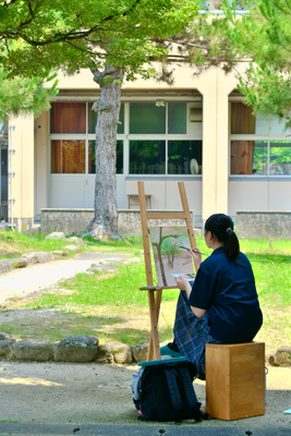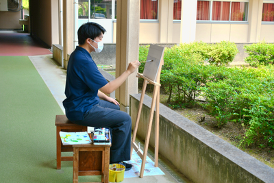 職員室前の廊下には、美術工芸コースの生徒の絵画作品が展示されています。