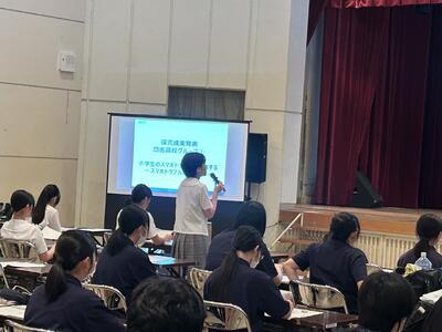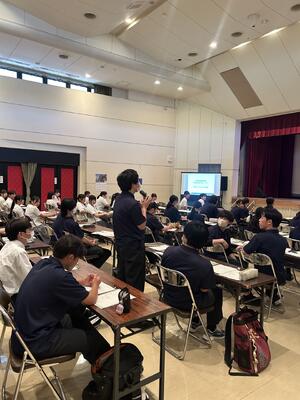 火曜日は、アドバンストコースのアドバンスト探究の発表が行われ、1年生から3年生までの代表者が伝統文化やキャリアインタビュー、進路の取り組みについて発表を行いました。