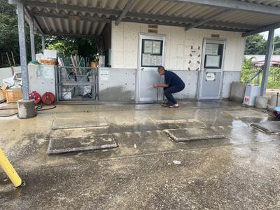 生徒たちは水を撒いて、ゴミ捨て場の床を綺麗に掃除していました。