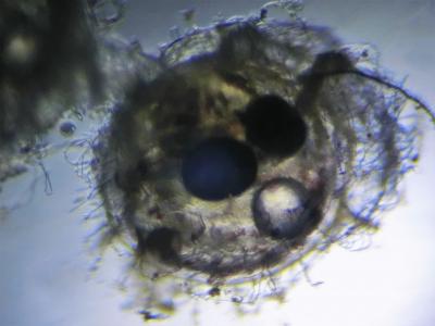 1週間ほどたった卵を顕微鏡で見てみると、黒い目や動く心臓が見えました。
