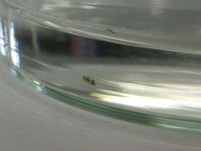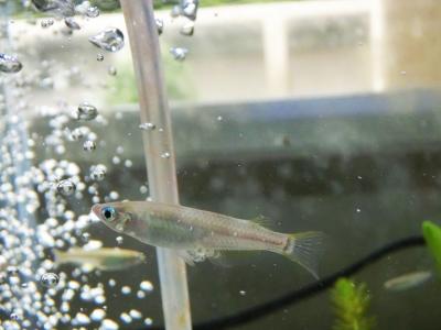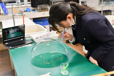 小さくて透明なのでうまく写真に撮れませんが、5mmほどの針のような小ささで泳ぐ稚魚の姿に生徒たちも「かわいい」と目を輝かせています。